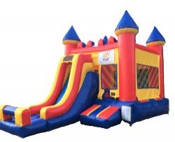 - Multicolor 13ft x 27ft bounce area with a slide attached.