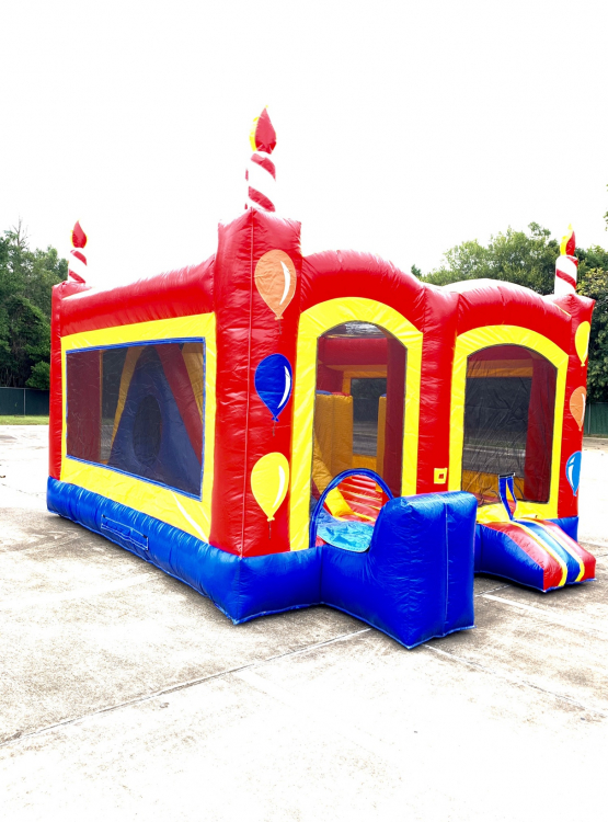 Make your child's birthday bounce with excitement! The Birthday Cake Combo is a 16'x15' inflatable party palace packed with fun. Dunk hoops like a champ with the mini basketball hoop, wiggle through the wacky mini tunnel, and zoom down the thrilling slide! This vibrant bounce house, decorated with delicious details, is the perfect recipe for an unforgettable celebration. So blow out the candles and get ready to jump for joy!