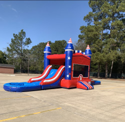 Unleash star-spangled fun with the American Combo bounce house! This 13'x13' inflatable palace boasts two thrilling slides, perfect for celebrating Independence Day, Memorial Day, the Fourth of July, or any day you want to show your American pride. Blast down the red and white slides, bounce under the blue sky roof, and create unforgettable memories for all ages. Let freedom ring with laughter and joy in the American Combo bounce house!