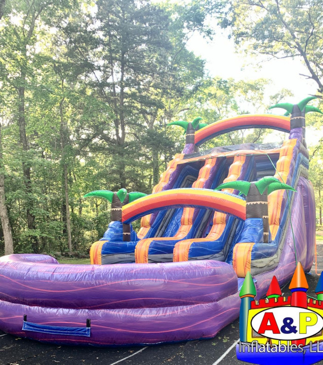 Cool off in style with the Purple Marble Water Slide! This 18-foot inflatable giant features two racing lanes for double the splashing fun. The vibrant purple marbled design makes it a standout at any party, while the built-in misting system keeps riders cool on hot days. Perfect for kids and adults alike, the Purple Marble Water Slide is sure to be a crowd-pleaser!